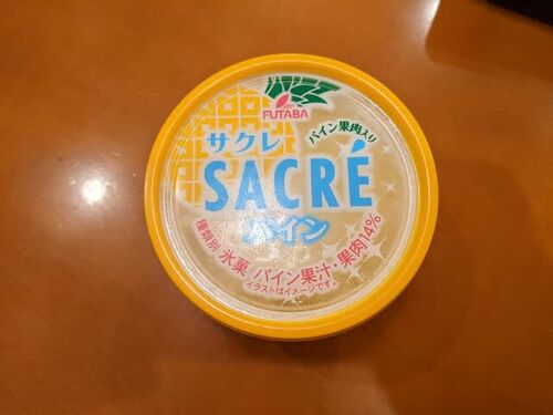 最近嵌っている氷菓、SACRE。 絶妙な味付け、最初は固いですが徐々にサクサク、特筆すべきはパインの果肉が入っていること。 堂々たる高さがあり、長時間味わえます。 最後の方でシャビシャビになった頃がまた美味い! 最後の最後まで果肉がゴロゴロあって嬉…